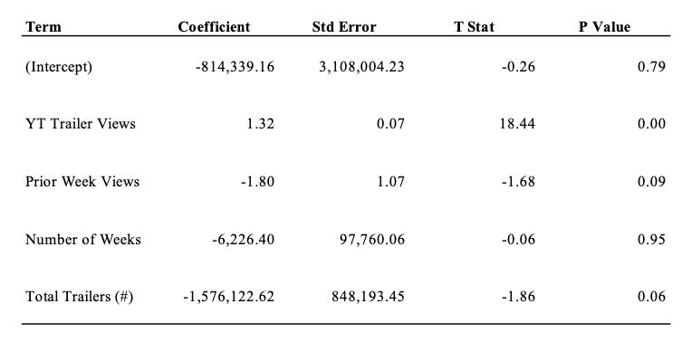 We have to take these results with a grain of salt, as there are many factors outside of just trailer viewership that impact a film’s success, but this regression implies that a film gains an additional $1.32 for every additional view its trailers garner on YouTube. When you get millions of views on your trailers, that has an economically significant impact on your film’s success.