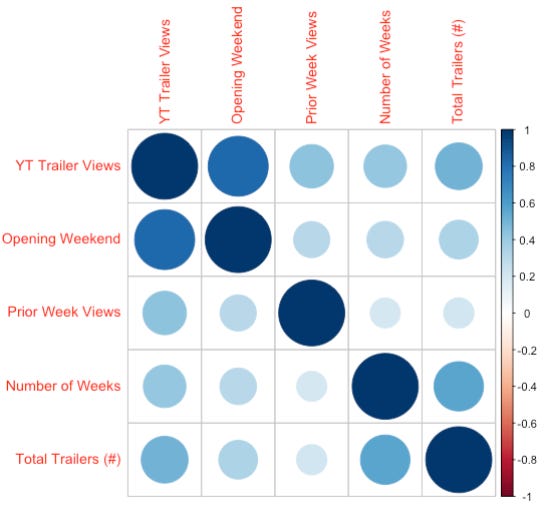 This analysis yields similar results: the correlation between YouTube Trailer Views and Opening Weekend Revenue was +0.83. You can view the correlation matrix below, which shows the correlation strength of the different variables I used in this analysis. Trailer views had by far the strongest relationship.